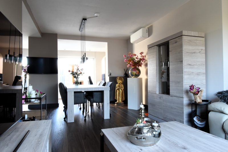 De woonkamer, 9.50 x 3.36 is v.v. een airco.