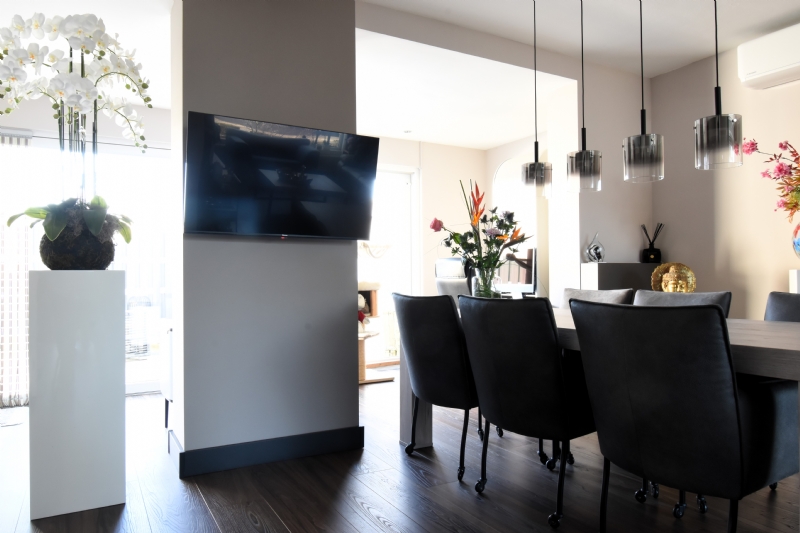De woonkamer en keuken vormen een mooi, ruim geheel.