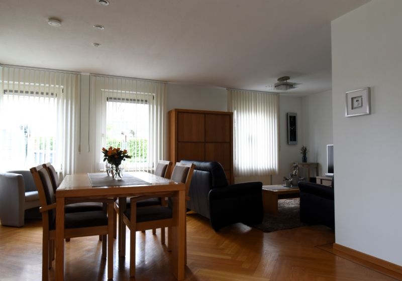 De L-vormige woonkamer, 5.65 x 3.85/3.55 x 2.90 is v.v. een hoogwaardige parketvloer.