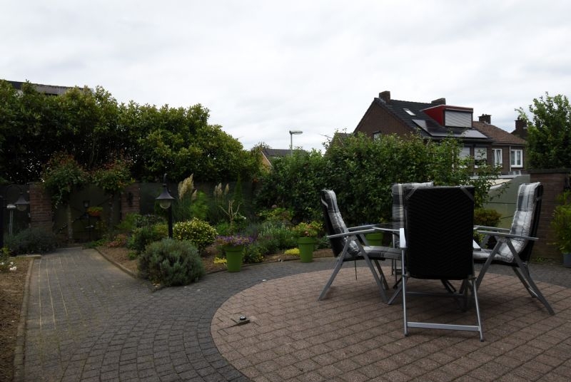 De tuin, 12.00 x 11.30 is gelegen op het N/O en via een zij-ingang ook te bereiken.