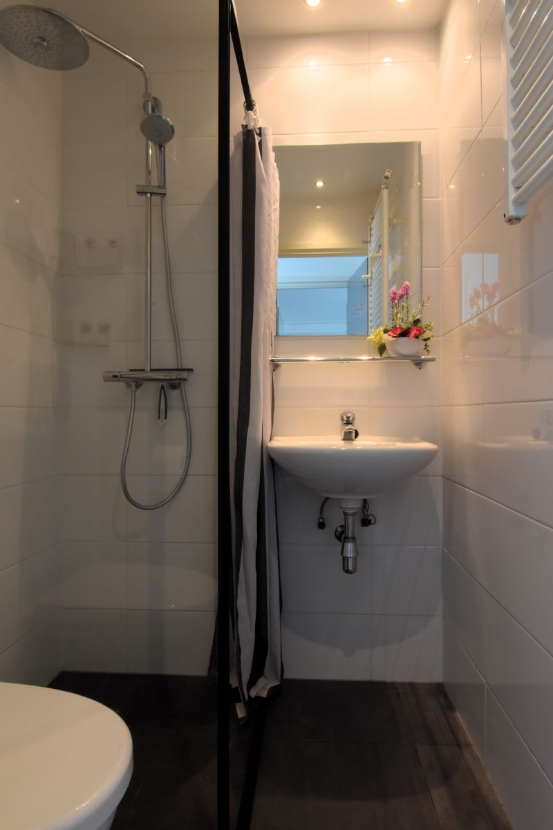 De, geheel betegelde, badkamer, 1.70 x 1.45 is v.v. een inloopdouche, zwevend toilet, wastafel en radiator.