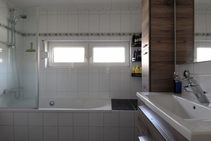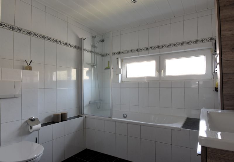 De badkamer, 2.56 x 2.32, is v.v. een ligbad/douche combi, vaste wastafel met meubel en hangtoilet.