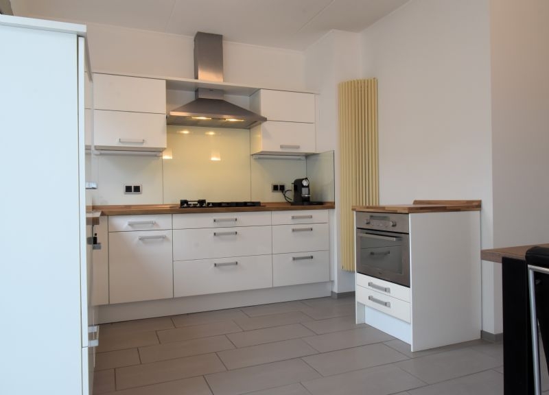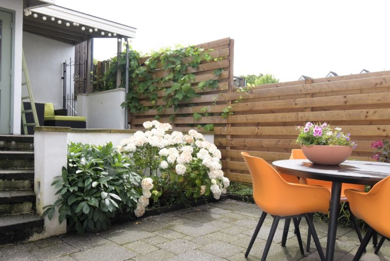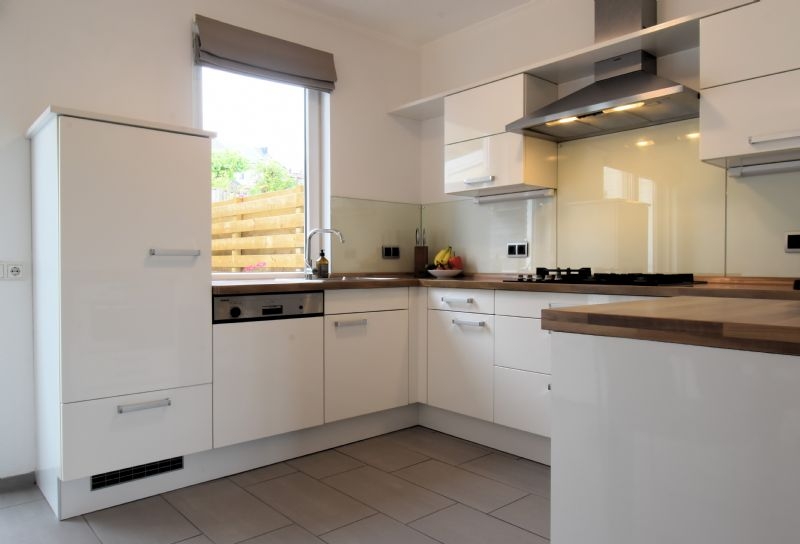 De grote schuifpui bij de keuken zorgt voor veel lichtinval en maakt de geheel omsloten, verzorgde achtertuin, met veel privacy, bereikbaar.