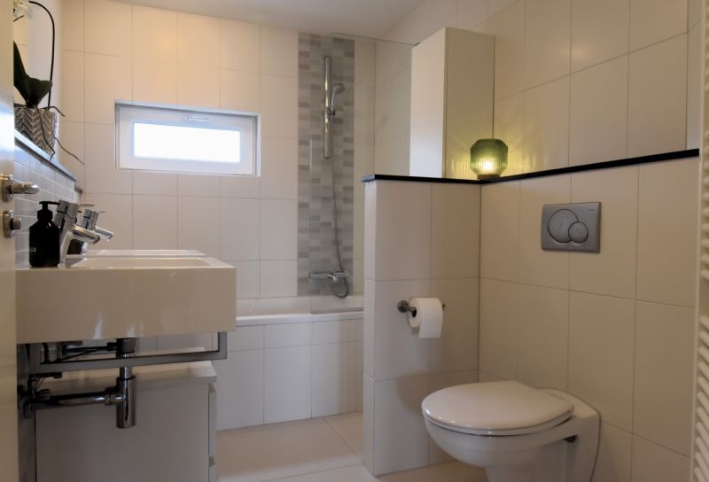 De moderne badkamer, 3.12 x 1.95, is v.v. een bad/douche combi, zwevend toilet, dubbele wastafel met verwarmde spiegel.