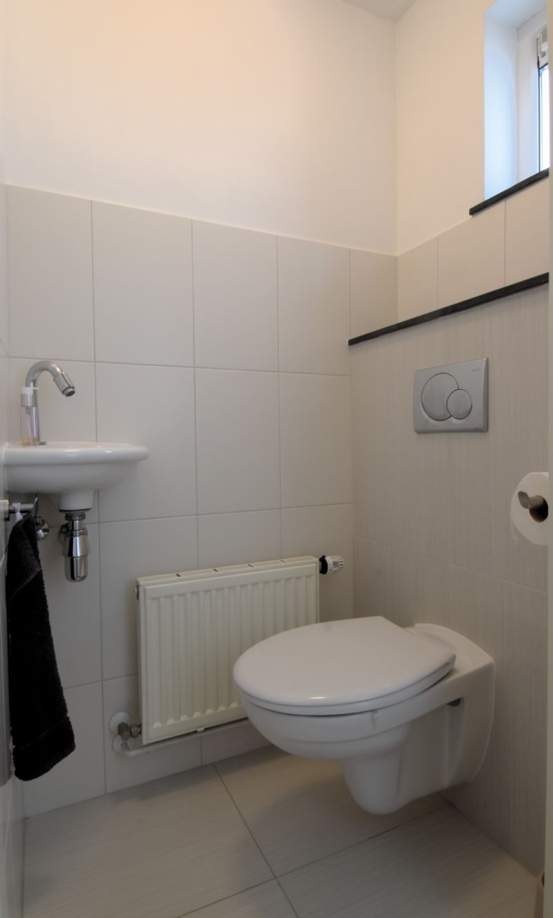 Modern toilet met zwevend toilet en fonteintje, garderobenis, meterkast (5 groepen, 2 aardlekschakelaars).