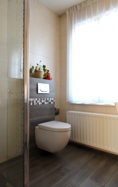 De badkamer, 2.72 x 1.90, is v.v. een inloopdouche, zwevend closet, wastafel met meubel.