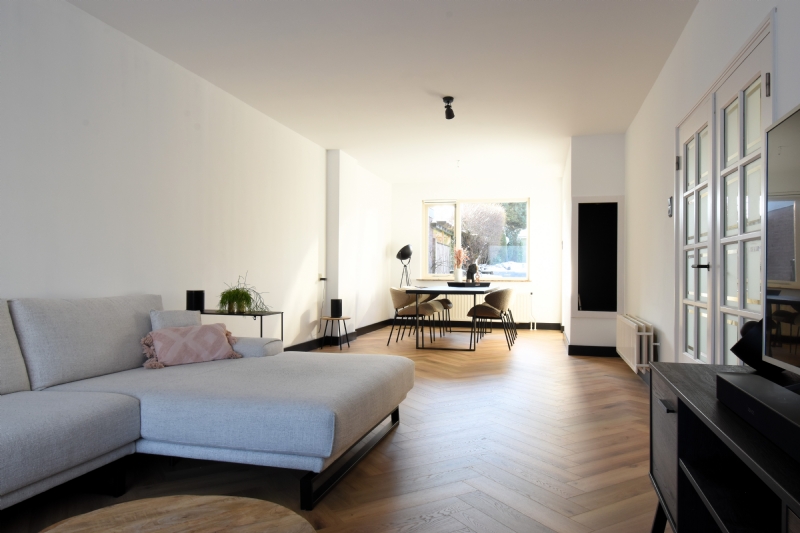 De prachtige woonkamer, 11.45 x 3.78, met erker is v.v. een visgraten pvc vloer. De woonkamer is te bereiken via de prachtige, authentieke openslaande deuren vanuit de hal.