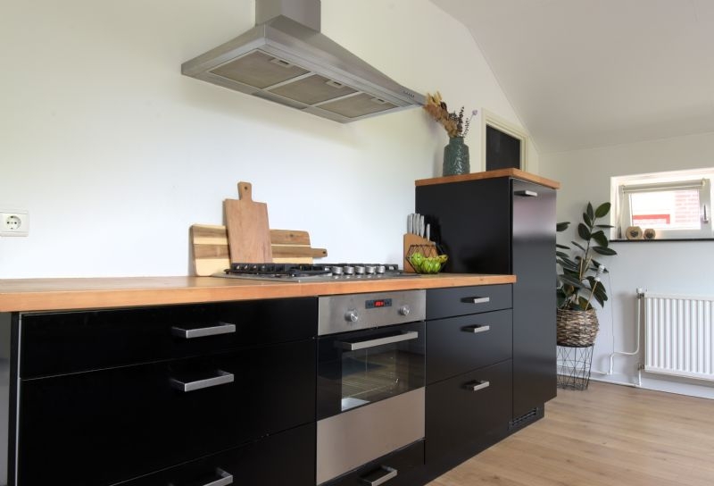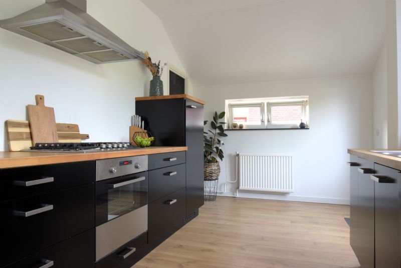 In de keuken is de volgende apparatuur aanwezig : fornuis, afzuigkap, koelkast, oven en vaatwasser.