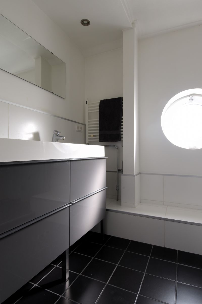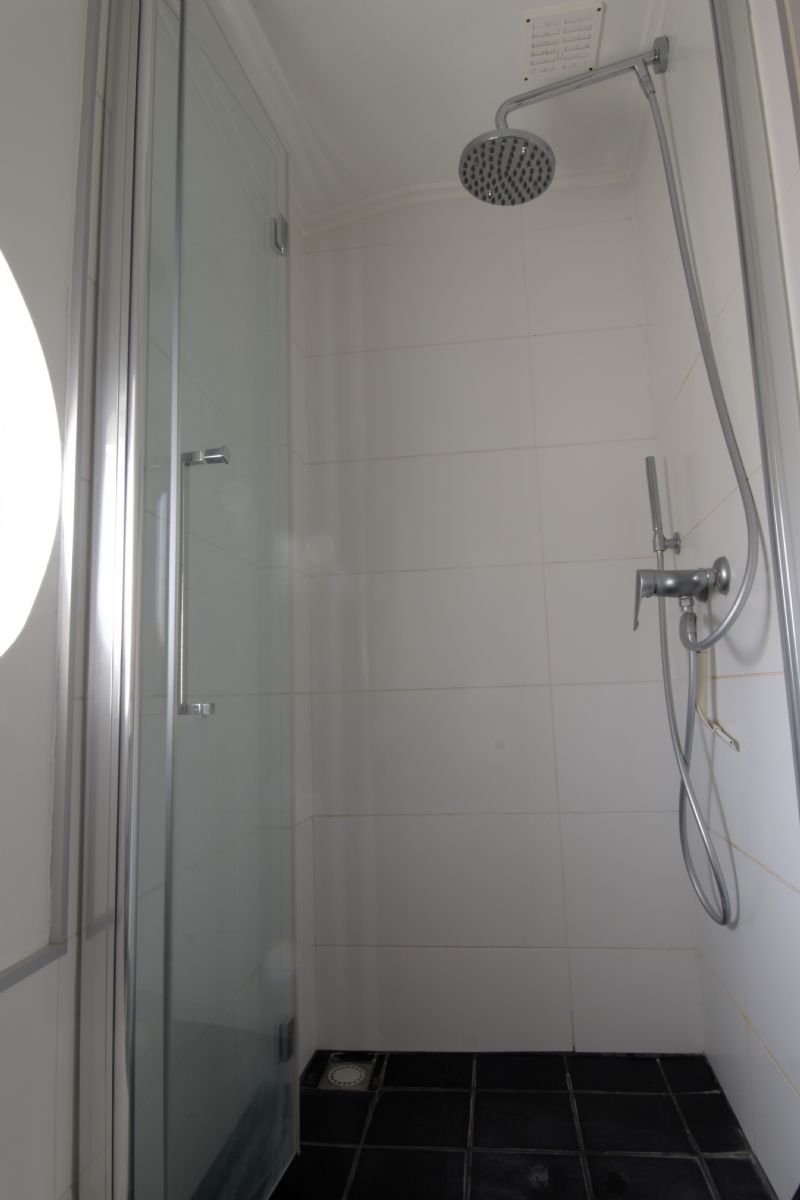 De badkamer, 2.55 x 1.90 is v.v. een douche en dubbele wastafel met meubel.