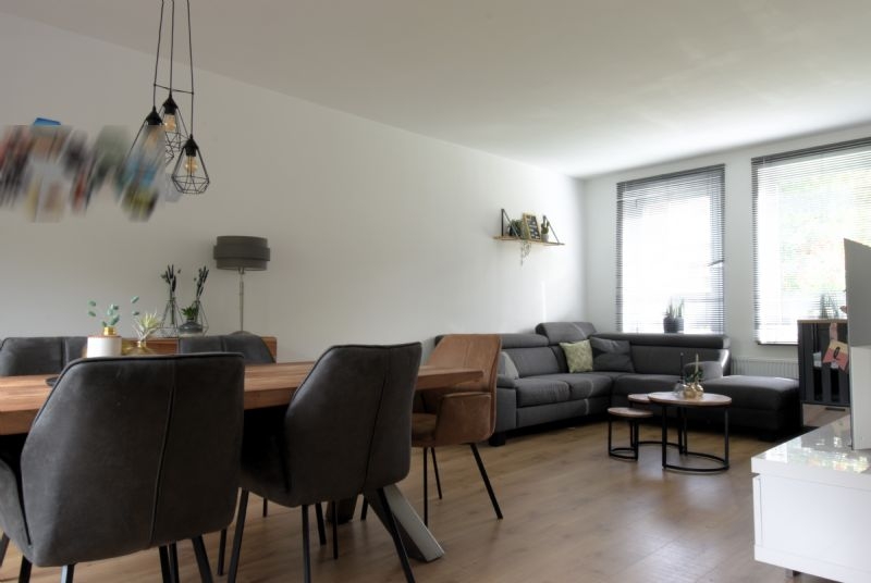 De woonkamer, 7.05 x 3.70 en open keuken, 4.25 x 2.70, zijn beide v.v. laminaatvloer.
